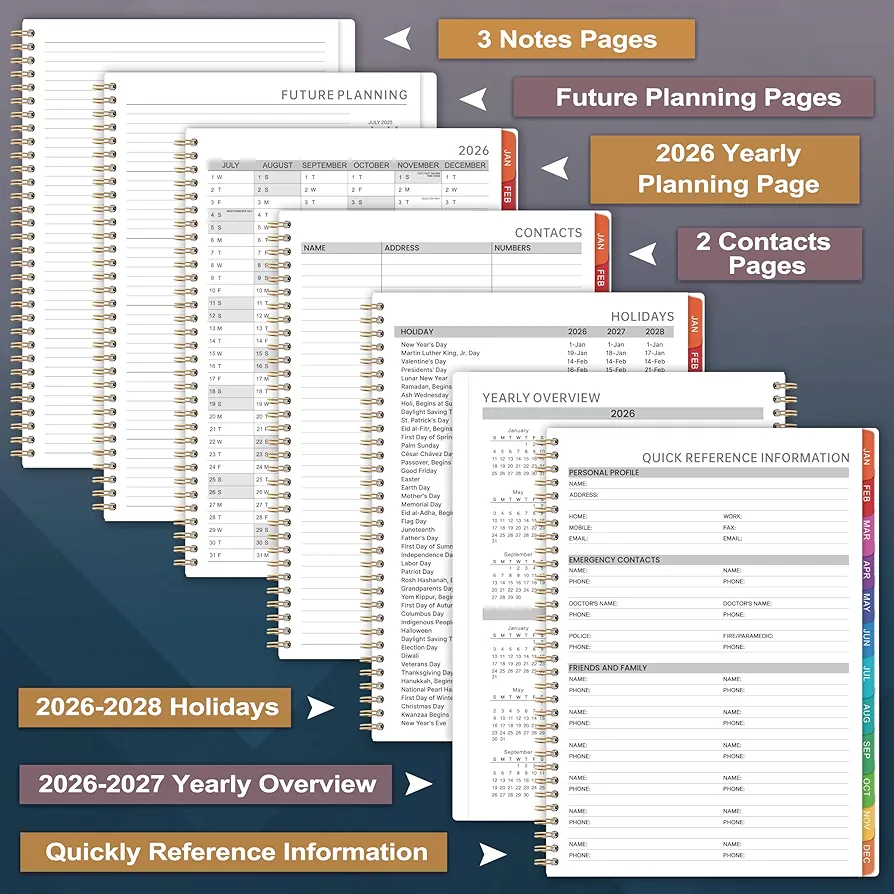 Functional Pages – This 2026 appointment planner includes quick reference information & 2026-2027 yearly overview & 2026-2028 holidays & contacts Page & annual plan page & notes to accommodate your scheduling needs. Perfect for home, office, school.