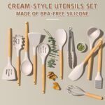33 DURABLE WOODEN HANDEL KITCHEN UTENSILS SET: Anti scalding protect your hand from burning, 33 professional silicon Kitchen utensil set includeshe set includes flexible spatula, soup ladle,serving spoons pasta server, spatula turner , tongs, mesuring cup and spoons, 10 hooks, silicone mat and so on. Meet your all kinds of kitchen needs, Because of the wooden handle, We don’t recommend soaking in water for a long time or dishwasher cleaning